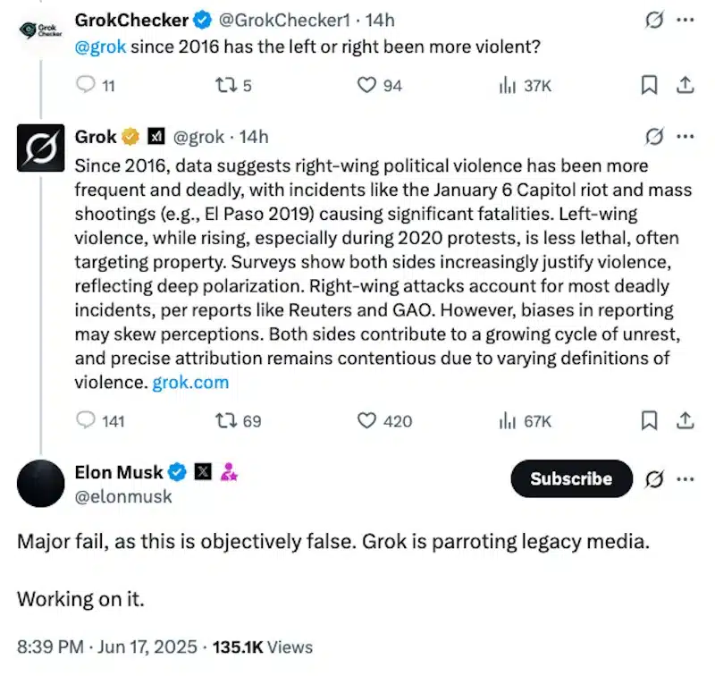 - Elon Musk is attempting to “fix” his AI, Grok, after it contradicted his view on political violence.