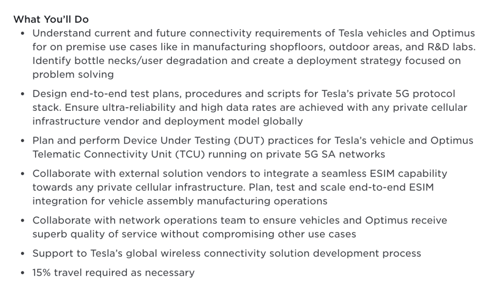 - 📱 The engineer will be responsible for delivering a best-in-class connectivity experience for all Tesla vehicles and Optimus, involving planning, executing test procedures, and integrating ESIM into Tesla’s private 5G network infrastructure.