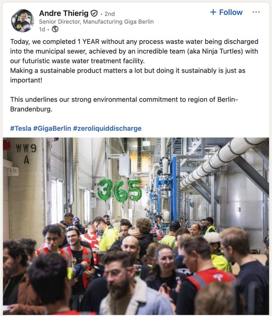 - Giga Berlin celebrates one year without discharging process wastewater into the municipal sewer system.