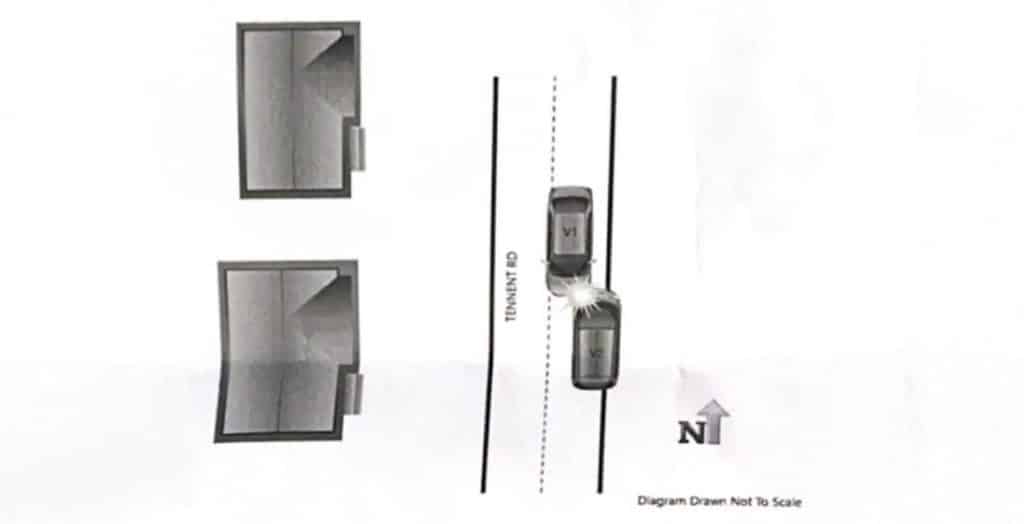 “Damage to the vehicles, as well as the final resting spots of the vehicles, revealed that Vehicle 01 (Towncar) crossed into the Northbound lane, causing Vehicle 02 (Tesla) to drive off the road to avoid collision. Both vehicles ultimately collided head-on.”