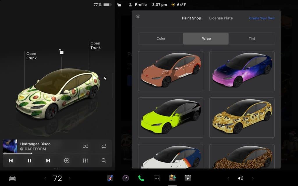 • Paint Shop Personalization: Formerly known as Colorizer, the Paint Shop allows for the customization of Tesla avatars with options for window tints, custom wraps, and license plates. Users can choose from preloaded designs or create their own using USB flash drives.