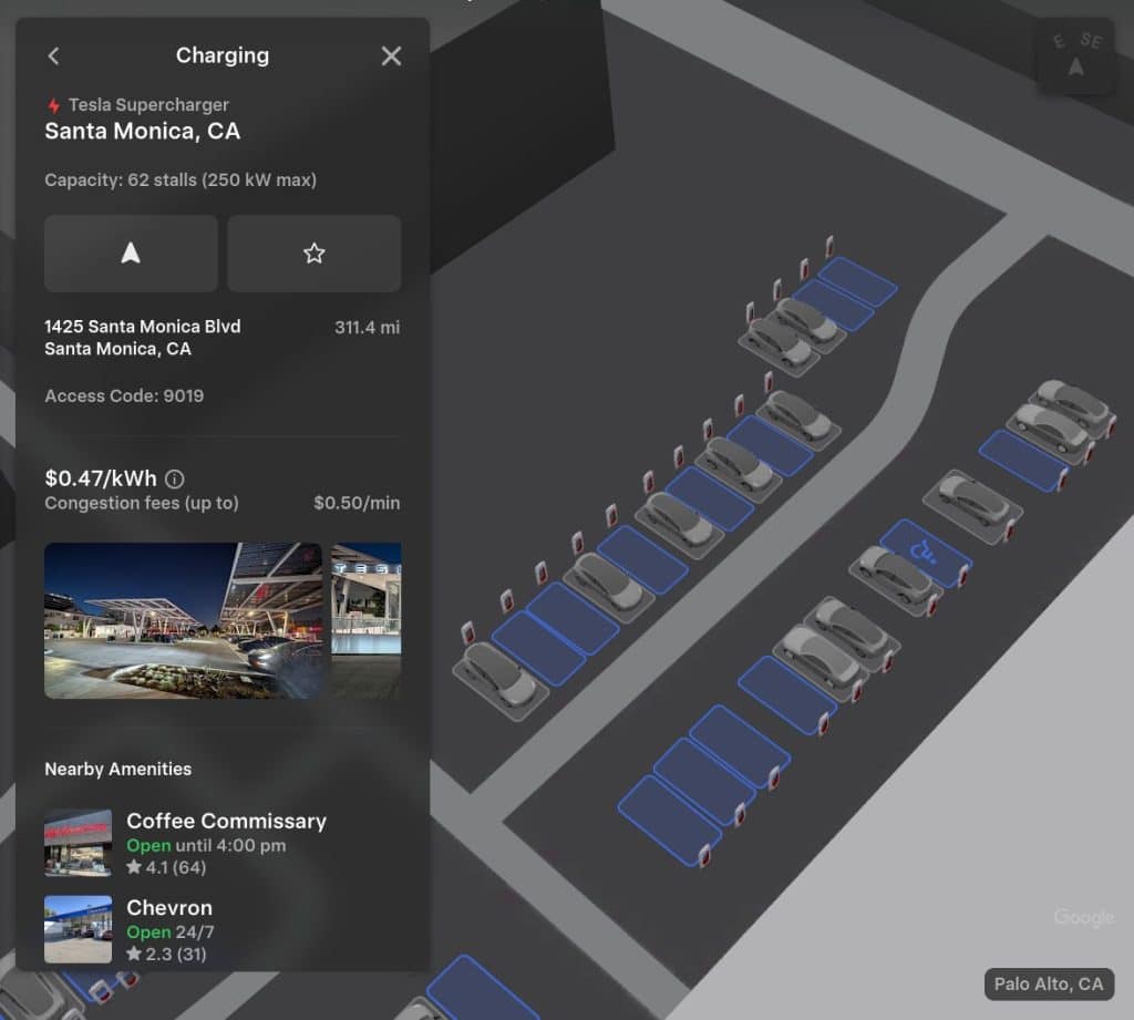 • Supercharger Site Map: The Supercharger site map takes navigation a step further by introducing a 3D view of select Tesla Superchargers. This feature shows site layout, live occupancy, and nearby amenities, even allowing drivers to choose Supercharging stalls.