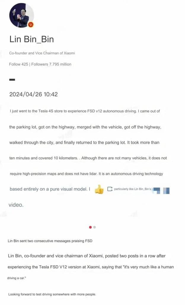 - 🚘 Xiaomi co-founder and vice chairman Lin Bin praised Tesla’s Full Self-Driving (FSD) system after a test ride.