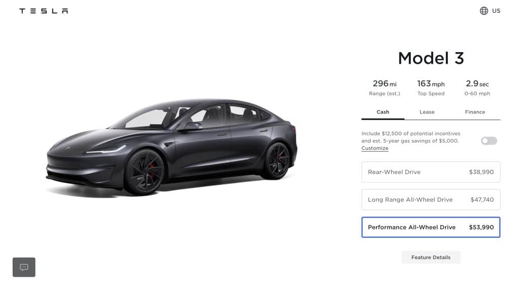 With the tax credit applied, the effective price of the Model 3 Performance drops to $46,490, making it more affordable than the Long Range configuration, which is ineligible for the incentive and carries a price tag of $47,740.