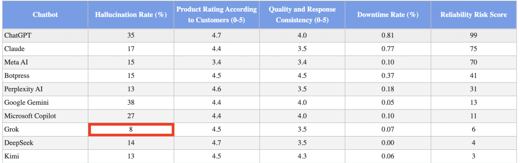 - Consistency and Downtime: With a consistency rating of 3.5 and a downtime rate of only 0.07%, Grok minimizes disruptions, enhancing reliable service delivery.